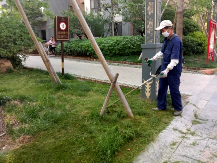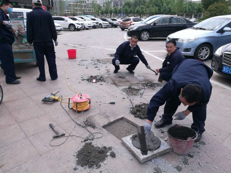 物业对损坏道路地砖进行修补对草坪进行修剪